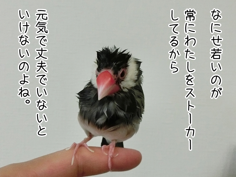 9歳8ヶ月 2019年12月24日 …… だけどたまには…寝ているところを静かに狙われるけどね(笑)▼にほんブログ村▼人気ブログランキングランキングに参加中。ポチっとありがとうございます。▼懐かしの日誌 http://rin-buncho.blog.jp/archives/1073144801.html△お姉さんだけど、可愛いんだから http://rin-buncho.blog.jp/archives/1073239754.html△そ~っと、でもむぎゅ~っとね 「ブンチョ日誌」カテゴリの最新記事 < 前の記事次の記事 > コメント コメント一覧 (13) 1. ぴぷ 2019年12月24日 06:39 モカちゃん最高にかわいい。これからもずっと、幸せに暮らしてね(о´∀`о) 0 りん がしました 2. れい 2019年12月24日 07:06 モカちゃんって若い頃からよく寝ていたし、換羽の度にハゲてたので(失礼な言い方してごめんなさい😅)、今も昔もあまり変わってな~なんて思っていたのですが、グルコサミン発言で、あ、やっぱりモカちゃんも年をとったんだなぁって笑ってしまいました笑 まだまだ若い子に負けないようグルコサミンでもコンドロイチンでもガブ飲みして頑張って下さいね笑 0 りん がしました 3. めぐりん 2019年12月24日 07:31 生きて一緒に過ごせるって奇跡なんですよね! 私の愛犬が今月亡くなりました。 ペットロスにはまってます…。 自分が年を取ると、別れが余計にダメージ来るみたいで仕事中は普通でいられんだけど、夜になると泣けて仕方ないです(>人<;) 毎朝、奥二重がクッキリ二重です★ 生きてる姿が見られる事、有り難いと思って笑顔で過ごしたいですね☆ 0 りん がしました 4. みゃあさん 2019年12月24日 07:39 ブンチョさんにしては かなりご高齢(失礼な表現ですいません)なお年なのに羽艶々だし 全く衰えてる感じないし すごいモカ様ぁ まだまだ元気でいてね✨らーちゃんやコロンちゃまから刺激たくさん貰ってねー✨ 0 りん がしました 5. 豆苗 2019年12月24日 08:08 おはようございます(^o^) モカちゃんの、つぶやき姿で なぜ水浴び後の頭がボサボサ?(笑) 人間にもいえるけど、周りの、刺激があると 気の張り合いがあって良いものですよね。 ラムちゃん登場でモカちゃんの 《ひとりっこライフ》は無くなりましたが ちーたんやコロンちゃんの登場も 良い刺激になってるはず♪と信じています。 0 りん がしました 6. さくらサク★ 2019年12月24日 08:08 モカちゃん、やっぱりかわいいです。💕 私的には、水浴び後が一番キュンキュン しちゃいます。 0 りん がしました 7. なさん 2019年12月24日 10:24 はじめて。 りんさんの付けるモカちゃんの女言葉がものすごく可愛面白くて毎回ツボです。😂 モカちゃんが本当に言ってるみたいです😂❗ りんさんのセリフのセンス才能ありすぎです。 0 りん がしました 8. みおな 2019年12月24日 11:13 モカ姉さんお誕生日おめでとうございます‼︎ 毎日とっても癒されています🌸 モカ姉さんの性格や容姿全て大好きです❤️ これからもストーカー?ラムちゃんと仲良く元気な姿を見せて下さい🎂 0 りん がしました 9. たけちゃん 2019年12月24日 11:13 モカちゃん、いつまでも愛し愛され、幸せな毎日を過ごしてください。うちの子も、モカちゃんを見習ってずっとそばにいてほしいです😊 ラーちゃん、ピカピカボディですね。 ふーちゃんは最近いかがお過ごしでしょうか?またアップしてください😆 0 りん がしました 10. ネネ 2019年12月24日 12:08 モカちゃんかわいいです~❤️ 9才8ヵ月…もうすぐ10才ですね! 元気で長生きのモカちゃんは、憧れです☺️ これからももっともっと長生きしてね(^-^) ラムちゃんのモジモジ感がいつもかわいくて好きです🎵 0 りん がしました 11. 雄二 2019年12月24日 13:31 モカちゃん誕生日おめでとうございます! あと ラムちゃん、コロンちゃん メリクリーヽ(´▽`)/ まだ、はやいかな? みんなで楽しんで下さい! 0 りん がしました 12. ぶんちゃん🍀 2019年12月24日 20:30 モカちゃん、いつ見てもお若いです。 これからもラムちゃん、コロンさんのお姉ちゃんとして宜しくお願いします。 我が家の文ちゃんも明日クリスマスがお誕生日です🎵3才になります。ここのところ残業で帰りが遅くなってかわいそうな日々💧 明日は早く帰ってあげたいなぁ☺️🐤 0 りん がしました 13. tidy 2020年01月12日 23:58 今晩は⭐️ 我がブンチョ君は、元迷い鳥なので、正確には不明ですが、 2019年12月24日お昼過ぎに、老衰にて永眠しました😭 10年3か月間、一緒に過ごしました。 多分、10才半以上は、経っていたと思います。 モカちゃんに、性格が似ていたかも知れないです😭 もの凄く優しくて、可愛い仔でした。 只今ブンチョ君ロスにかかってます。 直前まで、もの凄く元気で、餌も盛り盛り食べて、 でも、12月半ば過ぎには、餌も碌に食べなくなり、寝てばかりの毎日で、 でも、悪い所もなく、 それでも、ブンチョ君なりに、精一杯頑張っていましたが、 最終的には、看護も虚しく、永眠しました。 看護している最中は、常に触りながらの看護で、 何度も何度も、有難う。と伝えました。 ブンチョ君も、常に、うんうん、と、応えて