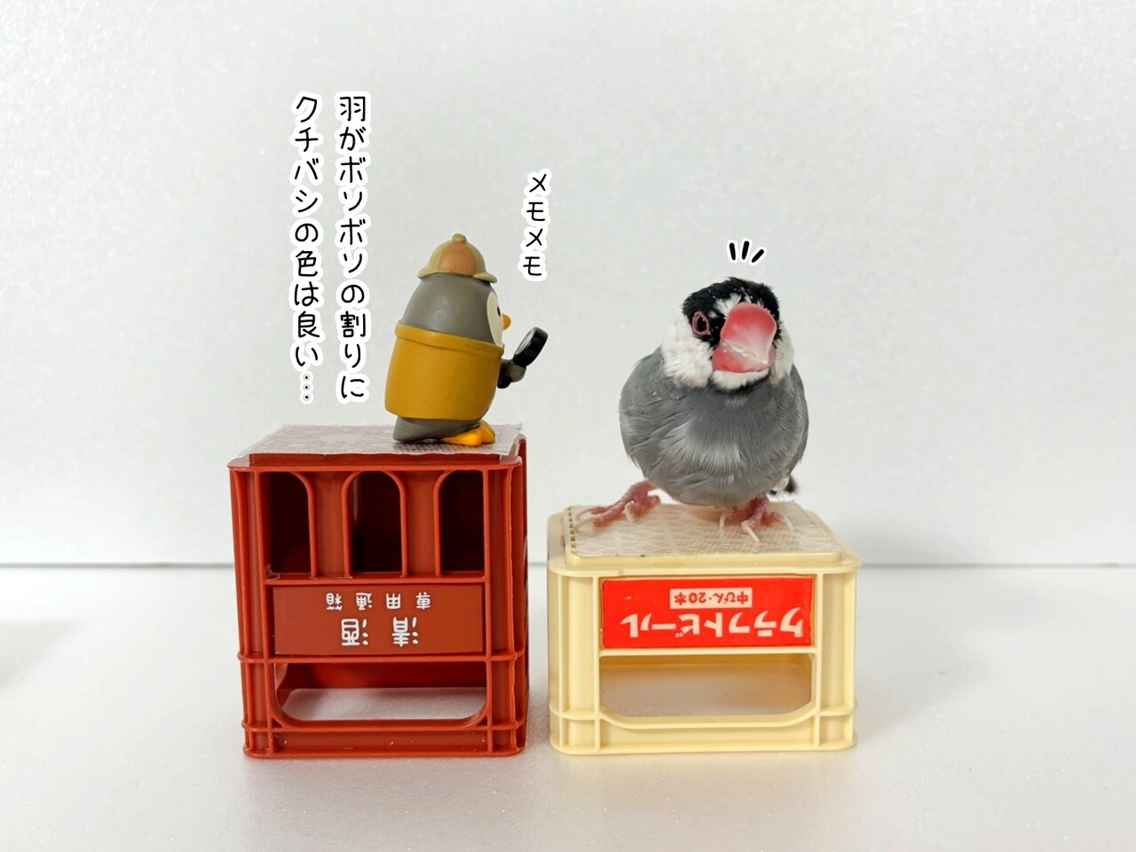 探偵フクロウ、報酬は必須です 2025年12月14日 セラがボーっと立っていると、隣りから声が聞こえてきました。探偵フクロウです。依頼主からの情報も確認しながら偵察をしています。(はい、ほぐさせていただきました)まだ本調子ではないのでね。守秘義務は絶対に守る。それが探偵フクロウ。しかし セラには目星がついていた。そして、セラは知っているのです。(…ちょんまげ?)そこで慌てて探偵フクロウは依頼主の元へ走りました。というわけで、 お金もないのに依頼をしたジルが悪いのか、バイト代をまだ支払っていないセラが悪いのか。さて、どっち?▽探偵フクロウシリーズ ブログの過去記事から3日誌 ▼噂の謎の洞窟を、リポーターラムが詳しく調べます! ▼無事追い払ったら、遊びに出ることを忘れたラム ▼ふたりを振り分けたら、あまりにもピッタリすぎた ↘ライブドアアプリで更新通知を受け取れますご登録ありがとうございます☆ 「探偵フクロウシリーズ」カテゴリの最新記事 < 前の記事次の記事 > コメント コメント一覧 (6) 1. 豆苗 2025年12月14日 07:35 可愛い探偵さん(^o^) セラくんおかさんに、まだわしゃわしゃ やってもらってくださいね〜(^o^) ジルくんはママんに抱っこされてくださいね♡ 0 りん がしました 4. りん 2025年12月17日 17:27 >>1 セラはもう大分ほぐさせてもらいました。 (そんなことするから余計逃げられるですが…) ジルはまだまだ甘えん坊なので抱っこし放題です。 0 りん がしました 2. コバ 2025年12月14日 07:40 ジルくん🐦すごい!度胸いいわね!💖フクロウ探偵さんに頼んで、お兄ちゃんのご機嫌うかがいとはね?百万年早いと怒ってたわよ、でもすこしずつ、良くなってるみたいね!おかさんに、無理やりほくされたみたいだけど、スッキリしたでしょ?そしてバイト代もはやくはらってあげてね😍ジルくん🐦のちょんまげもかわいらしいわね!💖 0 りん がしました 5. りん 2025年12月17日 17:29 >>2 セラは大分ほぐれました。 とはいえ、まだまだ綺麗ではないし本人はイラついたままです。 ジルは見た目はまだちょんまげ部分だけが濃い色になっている感じです。 0 りん がしました 3. ともとも🐦️ 2025年12月14日 09:02 ジルくんの”ちょんまけ“みたいに見える部分はいつどのようにそうなったか気になります(笑) まだまだしっかり者の店員になるには仕事に飽きたり買出しに寄り道したり頼りない見習いですがセラくんの教え方によってハイスペックなジルくんが収益を爆増してくれる可能性をも十分にありますので…セラくん、換羽終わったら後輩を台紙に育成してあげて下さいな❤ 0 りん がしました 6. りん 2025年12月17日 17:30 >>3 ジルのちょんまげは、大人の濃い色の羽が生えてきた部分です。 そこだけ変化している感じです。 ハイスペックなジルがどこまで貢献できるのか、ですねー。 0 りん がしました コメントフォーム 名前 コメント 記事の評価 リセット リセット 顔 星 情報を記憶 コメントを投稿する