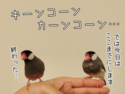 ふたりで目標を立てる? カテゴリ : ブンチョ日誌文鳥たちの愉快な会話 ちーたんの今後のことを考えて今までと違う床材等娘が買いたいというのでペットショップに行ってきたんです。 そしたら多分ヒナの頃に売れ残って今はそこで大事に飼われている子たちが(売られている子はケージに入っていました)自由に飛んでいてビックリ。(゜▽゜;) ちょ ... 2019年08月26日 続きを読む