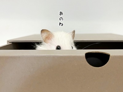 今日のミント(7/29追記) カテゴリ : 長毛ハムスターのミント とても丈夫な箱が手に入ったので早速ミントを入れてみたのですがはいはいうんうん(゜▽゜;)あ、やっぱり?凹凸もなければ穴もなくて何もない箱だったので全然楽しそうにしてくれませんでした(´∀`;)(しゃべれなくても態度でわかりますよねー)▼ところで全然本編と関係ない ... 2023年07月29日 続きを読む