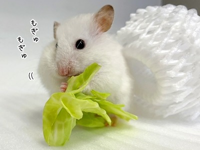今日のミント(8/25追記) カテゴリ : 長毛ハムスターのミント 今日買ったキャベツを洗って水気を拭いて持って来ました。やっぱり新鮮だと食いつきが良いです。うん(〃>З<)実は、キャベツをあげる前に梨の入っていた白いネットで遊んでいたんです。で、その状態のままキャベツを出したらすぐに食べ始めたっていう。ネットからはもうほぼ ... 2023年08月25日 続きを読む
