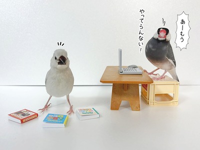 ジルの一日体験入学 カテゴリ : 文鳥学校・文鳥病院(ごっこシリーズ)ジルの子ども時代 ジルたん、学校初体験にやって来ました。入学した暁にはしっかりと出演していただくのでね、まずは一日、この先やっていけそうか体験して考えてもらえたらいいなと思います。…すると、 突然ジルが本を蹴飛ばしながらその場から飛んだので、反射的に同時に飛び上がったセラ ... 2025年10月21日 続きを読む