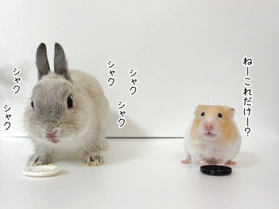 今日のプリンとうさぎのルリ(10/21追記) カテゴリ : クリームバンデッドのプリンうさぎのルリ 甘くて美味しいシャインマスカットをルリとプリンにお裾分けしました。 プリン先輩はすぐに手に取り頬袋に詰め始め、ルリくんはあまりの美味しさに感激しているようです。上手に手を使うプリン先輩と違ってボタボタと汁を垂らしながら必死でよく噛んで食べていくルリくん。 ... 2025年10月21日 続きを読む