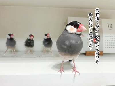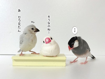決まりを守らないと カテゴリ : 文鳥学校・文鳥病院(ごっこシリーズ)ジルの子ども時代 先日の体験入学を経て、このたび正式にジルが入学してきました。 自分より年下の子が初めて学校に通うことになったので、セラが大事なことをジルに教えようとします。…が、乗った。慌ててセラが小さい声で注意をしたのですが、ん?ジルたん…あんたって子は…はい、セラも ... 2025年10月29日 続きを読む