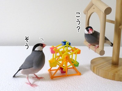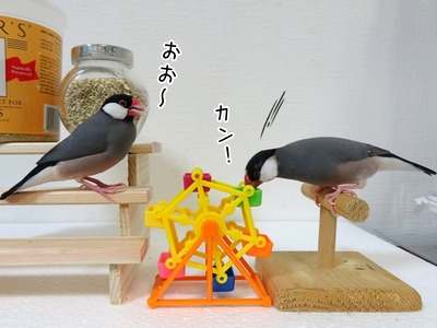 観覧車とおやつと文鳥 カテゴリ : イベント・グッズ・買い物おやつタイム 昨日、コロンさんに出した観覧車に鳥たちのペレットと青米を入れてふたりの遊び場に置きました。早速気づいたラムです。セラも気がついて食べ始めたのですが…(しかしなんだあのラムの丸い腹は…)静かにラムに近づいていき突然ラムに攻撃しようとしたので(写真は撮れなか ... 2021年07月01日 続きを読む